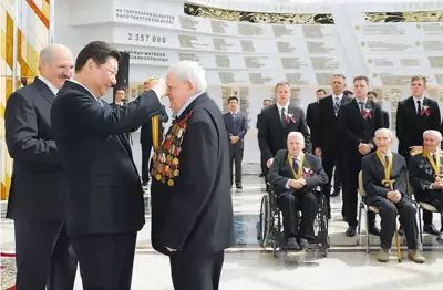 白俄罗斯共和国老战士委员会副主席茹科夫斯基今年88岁,曾经3次奔赴中国参战。他说:“白中两国的友谊历久弥新。今天有幸从习主席手中接过这枚象征着和平与友谊的奖章,我跟中国的关系又近了一步。”