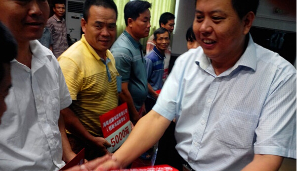 在发放仪式现场,儋州市中和镇长村村委会长山田村民吴传达紧紧握着黄桂提的手表示感谢。吴传达说,他家大儿子是在去年考上了大学,因家庭贫困是靠政府救助才上了大学。今年他的双胞胎儿子吴景武、吴景亨又同时考上了大学,为了俩个儿子能同时走进大学学堂,吴传达愁白了头。“这次要不是省人大代表黄桂提的资助,我家俩个孩子上不了大学。”吴传达说,他这次领取了1万元的助学金。