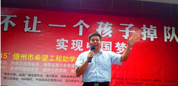 希望工程圆梦行动助学金发放仪式在欢快的音乐声中开始,100名贫困学子家长分四批从主席台上每人领取5000元的助学资金。儋州市教育局副局长刘长建发言对多年来关心支持儋州市教育事业的爱心企业、爱心人士表示感谢,特别对海南省人大代表、海南创新书店有限公司董事长黄桂提个人捐献50万元资助儋州千名学子上学表示赞扬。