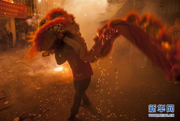 2月8日,在印度西孟加拉邦首府加尔各答市,印度华人舞狮庆祝中国农历新年。 新华社发(通帕·蒙达尔摄)