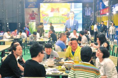 世界杯期间,成都球迷一边吃喝畅聊一边等待比赛开始。杨涛摄