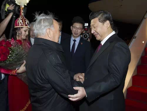 9月6日晚,习近平抵达阿斯塔纳,开始对哈萨克斯坦进行国事访问。哈萨克斯坦总统纳扎尔巴耶夫前往机场迎接。