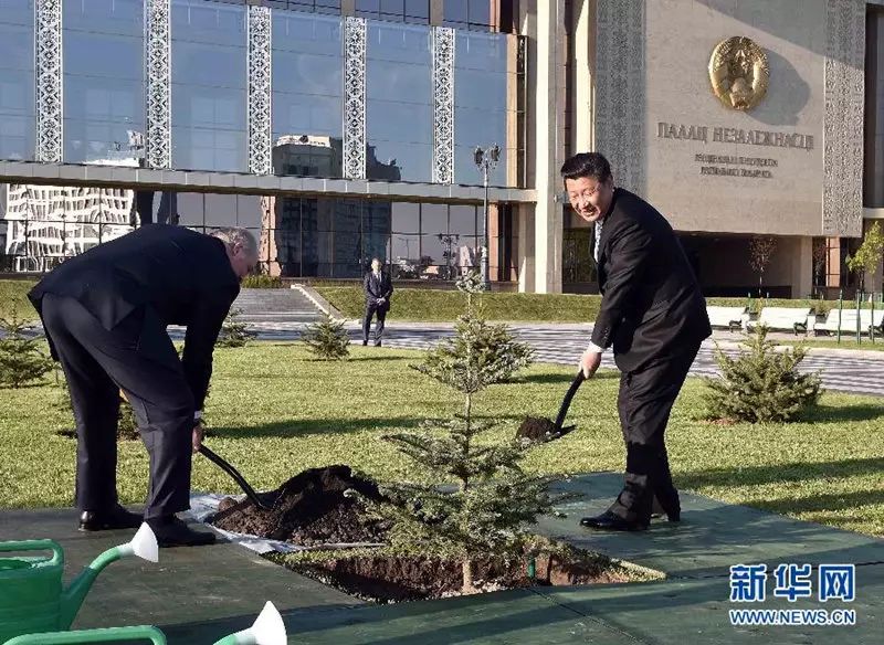5月10日,国家主席习近平与白俄罗斯总统卢卡申科一道,在明斯克独立宫贵宾林种植象征两国人民友谊的云杉树。 新华社记者 李涛 摄