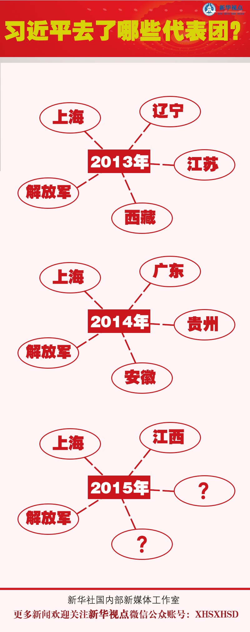 回顾十二届全国人大一次会议以来习近平去各代表团参加审议的情况,视点君发现,前两次会议上,习近平都要去五个代表团参加审议,以他所在的上海代表团开头,以解放军代表团收尾。
