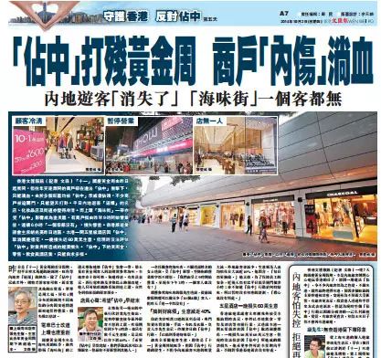 “十一”国庆黄金周由昨日起展开,但往年笑逐颜开的商户却在违法“占中”冲击下,只能滴血。由于多个旺区均被“占中”示威者占领,不少商户被迫关门,只能望天打卦。平日内地游客“逼爆”的名店、化妆品店及街道亦变得冷清。而上环“海味街”一带亦受“占中”影响成为重灾区,有商户指由昨早9时开始营业后,连续6小时“一个客都没有”,损失惨重。香港旅游业议会主席胡兆英昨日透露,本港一间五星级酒店因“占中”取消国庆烟花,一晚损失近60万元生意,但现时没法评估“占中”对业界所造成的经济损失。“占中”下的黄周金,零售、饮食与酒店业,只能自求多福。