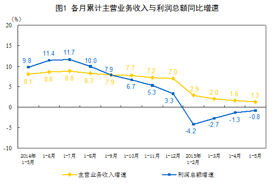 1-5月份,全国规模以上工业企业实现利润总额22547.6亿元,同比下降0.8%,降幅比1-4月份收窄0.5个百分点。