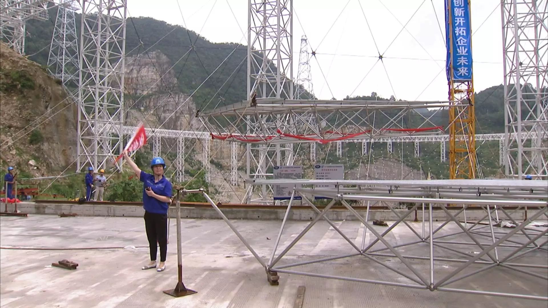 其实过程就是这样的:吊车抓取反射面单元——交给转运机车——转给缆索吊——滑到大窝凼底部的安装位置