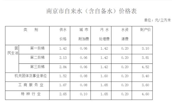 公开资料显示,南京现行水价执行的是南京市物价局2012年发布的《南京市物价局关于调整自来水价格的通知》。从当年6月1日起,居民生活用水从每吨2.8元涨至3.1元,其中包括了城市公用事业附加费、污水处理费、水资源费三项,价格分别为每立方米0.06元、1.42元、0.2元。除此之外,每月5元的垃圾处理费也由南京水务集团有限公司代收。