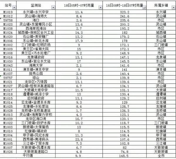 海口18日全市监测点雨量统计。