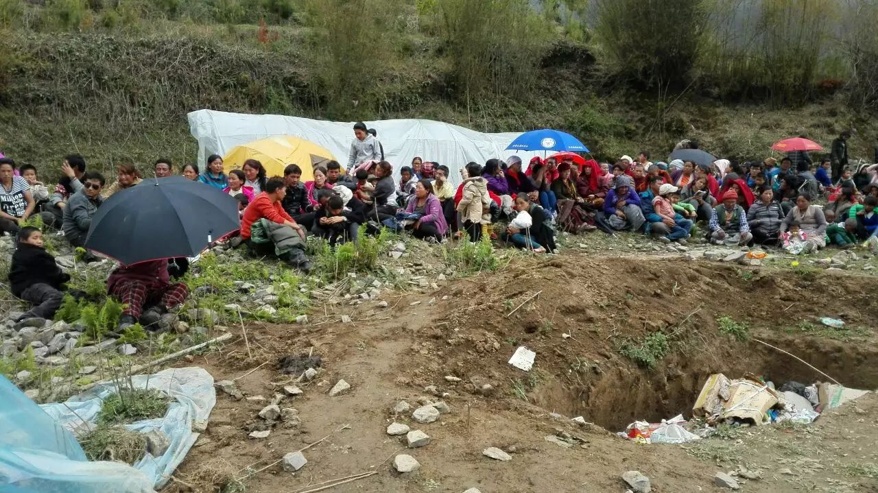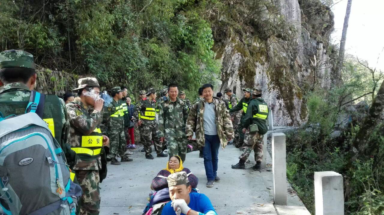 在得知撤离的消息后,驻村工作队的同志迅速协助当地官兵和边检救援队组织立新村民穿越塌方,他们背着老人,抬着担架冒雨向318国道方向前进。穿越巨大塌方带,不时伴随着轻微余震,滚石不断。立新村夏尔巴老人迪桑布,背着手走在队伍的最前面,休息的时候老人从胸前口袋掏出一片树叶放在鼻前闻着香味。老人什么行李都没带,唯独口袋里有个药瓶,里面装满了烟叶。他说,别的地方没有,这是家乡的味道。