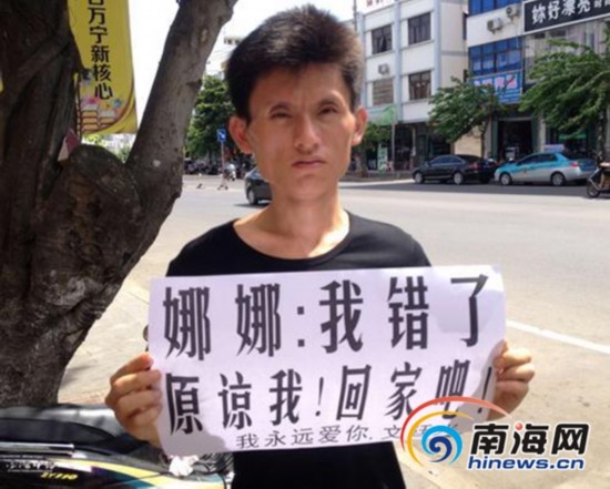 万宁一痴情男街上举牌求原谅——