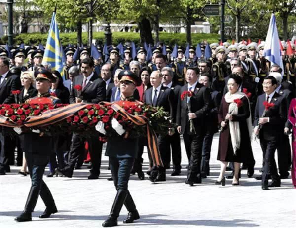 2015年5月9日上午10时(北京时间15时),俄罗斯纪念卫国战争胜利70周年阅兵式在莫斯科红场举行。中国三军仪仗队意气风发,目光如炬地走在红场,威武之师的脚步声伴随着前苏联的军歌《喀秋莎》显得格外铿锵有力。70年后中国的铁血军团又与俄罗斯军队一起纪念战争胜利的节日,欢乐激动的场面似乎是历史在冥冥之中早已注定。习大大微笑地向仪仗队挥手示意,普京总统因为习大大的到来感到十分高兴。习大大在访问俄罗斯的同时参加了这次盛大的阅兵式,与普京总统站在一起共同回忆反法西斯战争中中苏两国的深厚情谊。这两位大国领袖正从历史当中汲取两个大国走向未来的智慧。