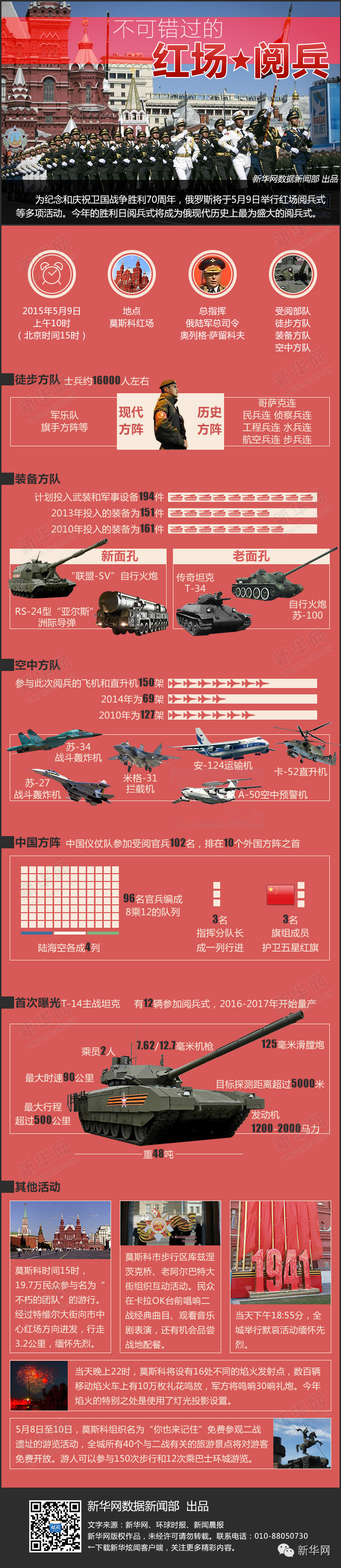 莫斯科时间9日上午10时(北京时间15时),俄罗斯纪念卫国战争胜利70周年阅兵式将在莫斯科红场隆重举行。此次有超过1.6万人参加阅兵,创造俄现代史上阅兵规模之最。