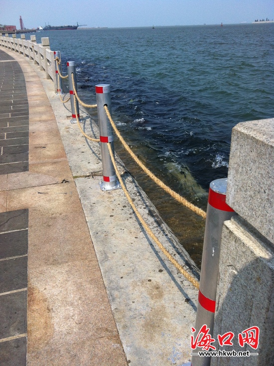 13日上午11时许,记者在海口湾领市馆附近海边看到,海边护堤上的水泥护栏确实被台风打烂,倒在岸边的海水里。不过在损毁的护栏处已经设置了临时护栏,长共100多米。新护栏为铁质,直径六七厘米,高近1米,相邻护栏间还用大拇指粗的麻绳相连接,起到防护作用。但记者发现,临时护栏间的两根麻绳比较松散,牢固度远不及之前的水泥护栏,行人要是倚靠就有跌落的危险。临时护栏上还张贴着两处白底红字的公告,上面写着“因台风受损,设临时护栏。注意安全!”记者注意到,还是有市民不顾公告攀爬护栏到海边。