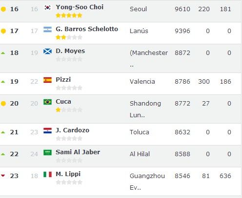 在亚洲俱乐部执教的教练方面,首尔FC主帅崔龙洙位居世界第16位,排名与上期一致,积分达9610分,连续两期高居亚洲第1位。虽然山东鲁能近期战绩不佳,但山东鲁能主帅库卡排名再次超越里皮,位列世界第20位、亚洲第2位,积分达到8772分,较上期增加27分,在所有中超教练中排名第1位。尽管广州恒大高居中超联赛及积分榜第一位,也打进了亚冠联赛8强,但或许受到了主场0-1负于大阪樱花、0-1负于广州富力的影响,恒大主帅里皮的世界排名不升反降,排在世界第23位、亚洲第3位,世界排名与上期相比下降5位,积分达到8546分,较上期减少555分。