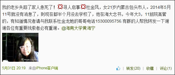 2014年5月31日,网友“@隐形的猫”发了一个微博,说来自内蒙古包头市今年21岁的海南大学大三女生杜某凤从5月中旬开始“就没有消息了,到现在都半个月没去学校了”,女生家人很急。为此,远在北京工作的杜某凤哥哥心急如焚。可是,当时采访过程中,杜某凤哥哥的态度却令人莫名其妙,而学校方面却未给出一个明确的答复。