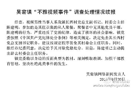 中共如皋市委宣传部官方微博今日通报吴窑镇“不雅视频事件”调查处理情况。涉事干部被免去长西村党总支副书记职务并被给与开除党籍处分。