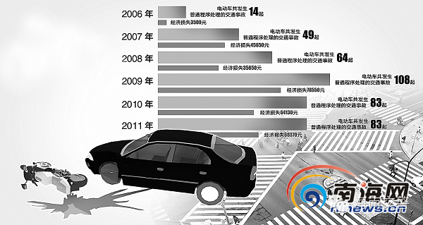 【三、海口电动自行车“那些事故”】2013年1月至2014年4月,海口市共处理电动车交通事故364起,死亡57人,伤473人。涉事的电动车中,超标车居多。超标车的体形大、重量超大、速度快,但是车辆的刹车性能不好。其外观虽与摩托车相近,但本身的技术特点却决定了其制动性能与摩托车相差甚远,车速提高后,由于前制动力增加,有侧滑和前翻的危险。这导致超标车引发的交通事故,尤其是重大交通事故的概率远远大于普通非机动车和机动车。此外,超标车最高设计车速大于20km/h,某种程度上说,它与轻便机动摩托车无异。然而,超标车的驾驶员却无需考取机动车驾驶证,低门槛导致超标车驾驶员交通安全法律知识比较缺乏。
