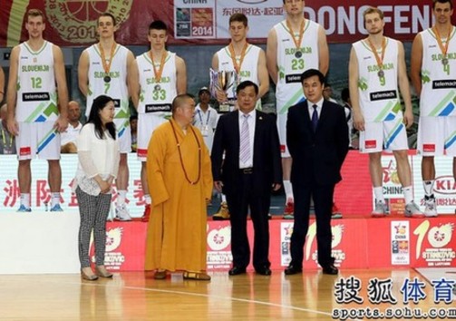 北京时间8月4日,2014年斯坦科维奇杯落下大幕,俄罗斯获冠军、斯洛文尼亚获亚军、中国队获季军。图为少林寺方丈释永信为斯杯亚军斯洛文尼亚队颁奖。(搜狐体育李志岩/摄)