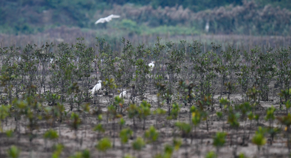 2020年12月23日,鹭鸟在海南东寨港栽种好的红树林内活动。新华社记者杨冠宇摄