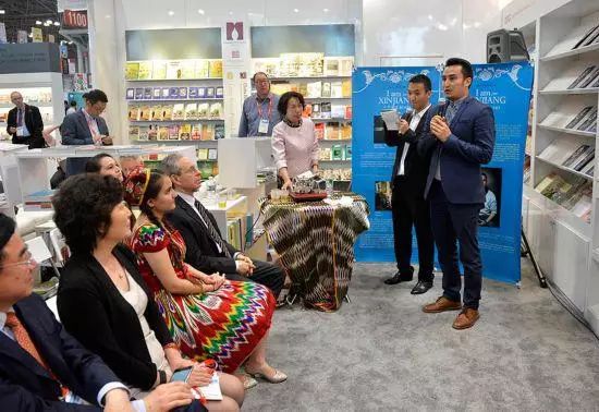 由中国国际图书贸易集团公司在亚马逊网站上运作经营的“亚马逊中国书店”展位备受瞩目。通过书展开幕前期发布的线上预告,很多忠实读者来到展位与工作人员交流。 听库尔班江讲新疆故事